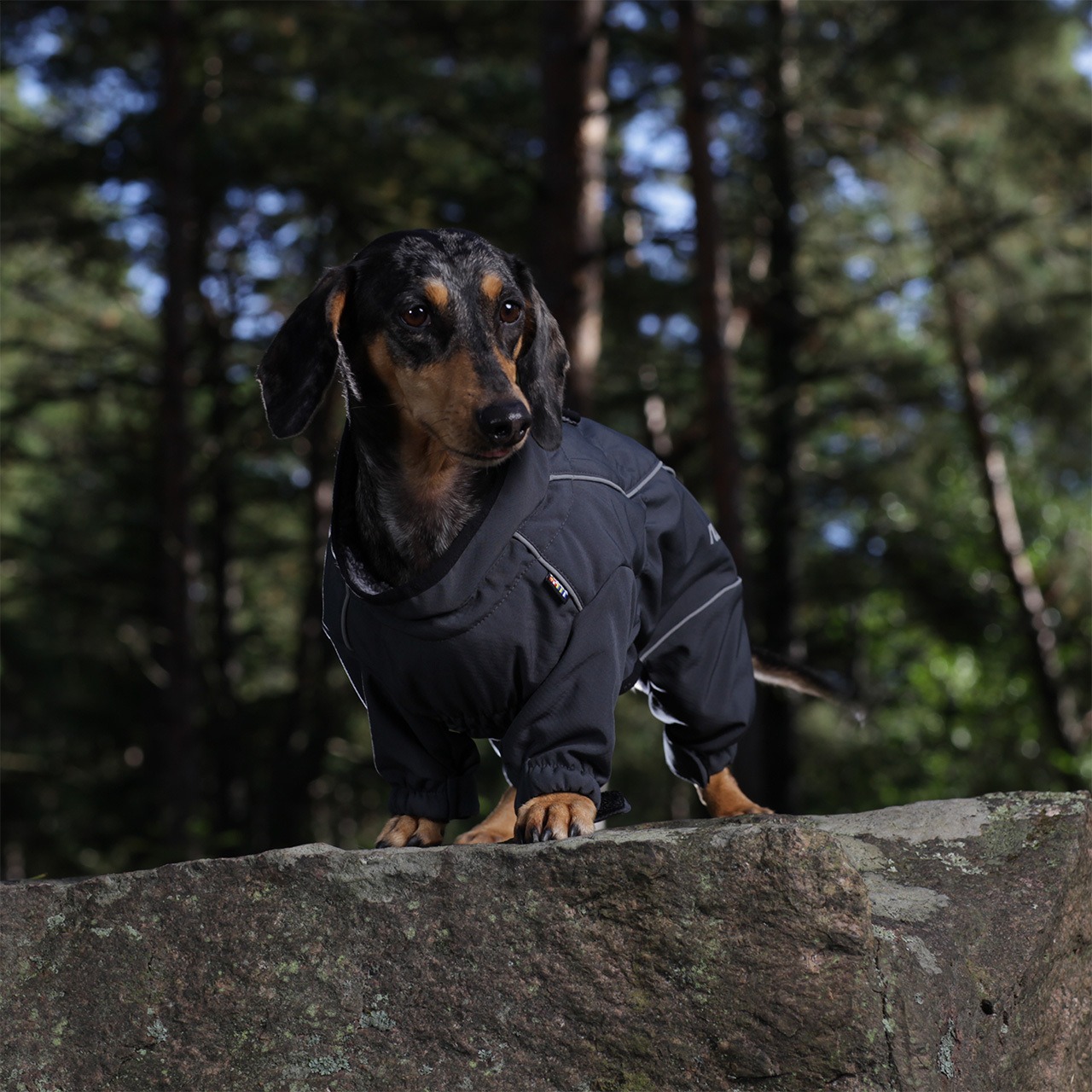 ジッパー裏に犬の毛や皮膚を保護するウィンドリスト付き