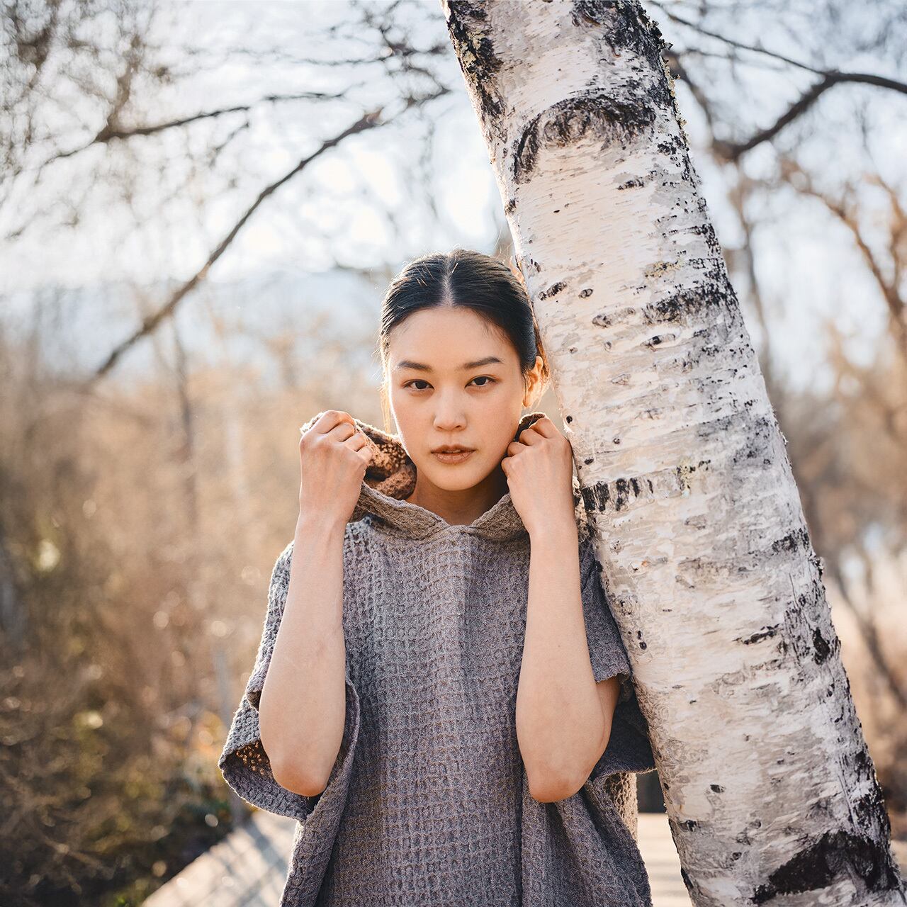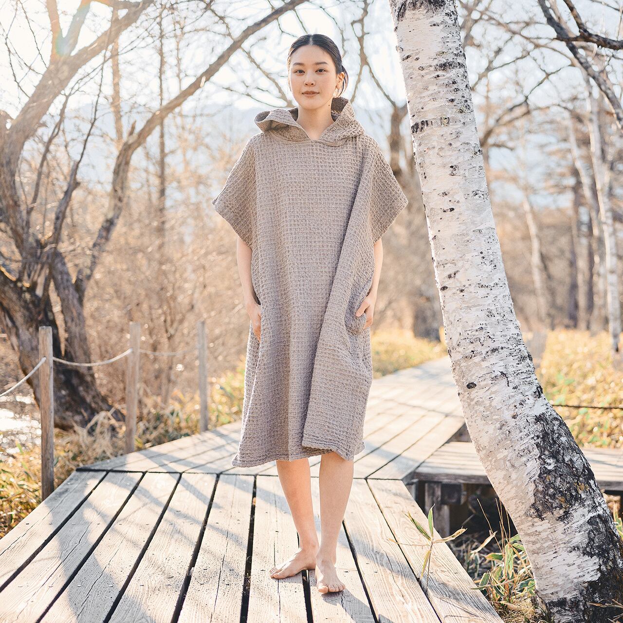 ワッフル織の凹凸が肌との接触面を少なくし、濡れた状態でも快適に着用できる北欧らしいシンプルなデザインのポンチョ。水風呂や外気浴後に羽織れば、素早く水分を吸収しながら保温もしてくれるので、サウナシーンに欠かせないアイテムです。
