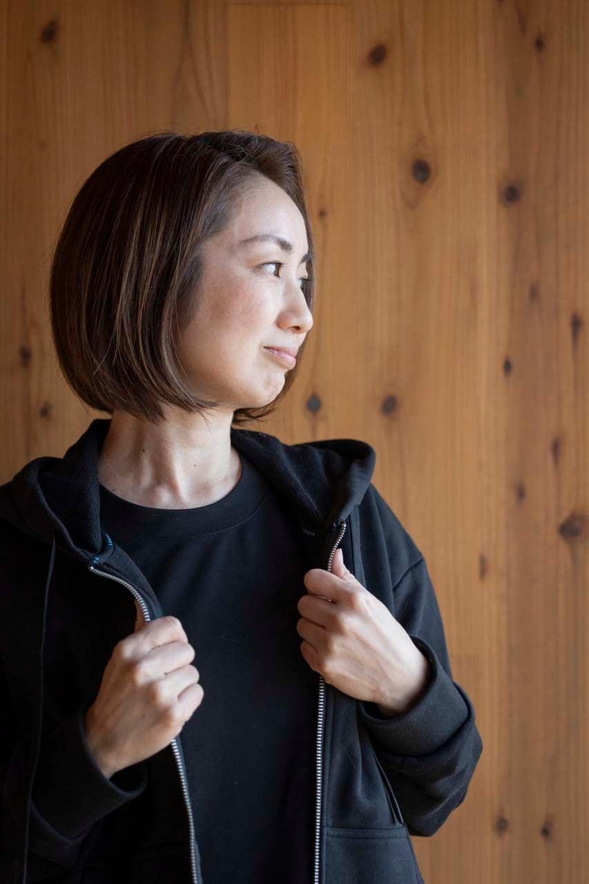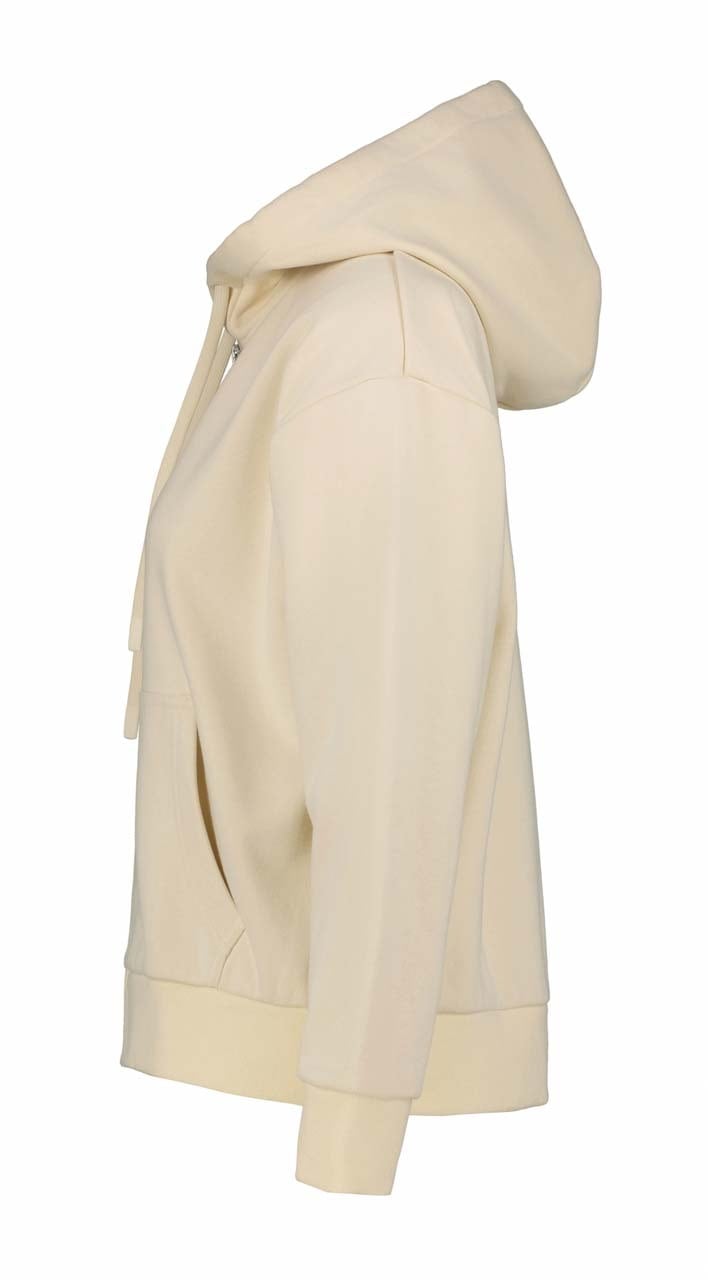 コットンをベースにしたやわらかな風合いと、程よいハリ感を兼ね備えたミドルレイヤーフーディ。ドロップショルダーのリラックスシルエットとショート丈のバランスが、スポーティで洗練された印象を演出します。単体でもアウターのインナーとしても活躍し、季節の変わり目に重宝する一枚です。